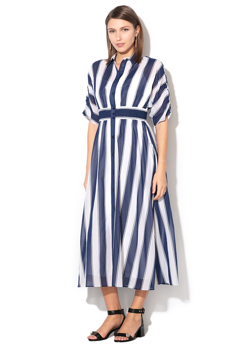 - alb Stil: casual Material: sintetic Model: in dungi Croiala: evazata Lungime: midi Guler: ascutit Tip maneci: medii Buzunare: laterale Inchidere: nasturi Compozitie Exterior: 89% acetat