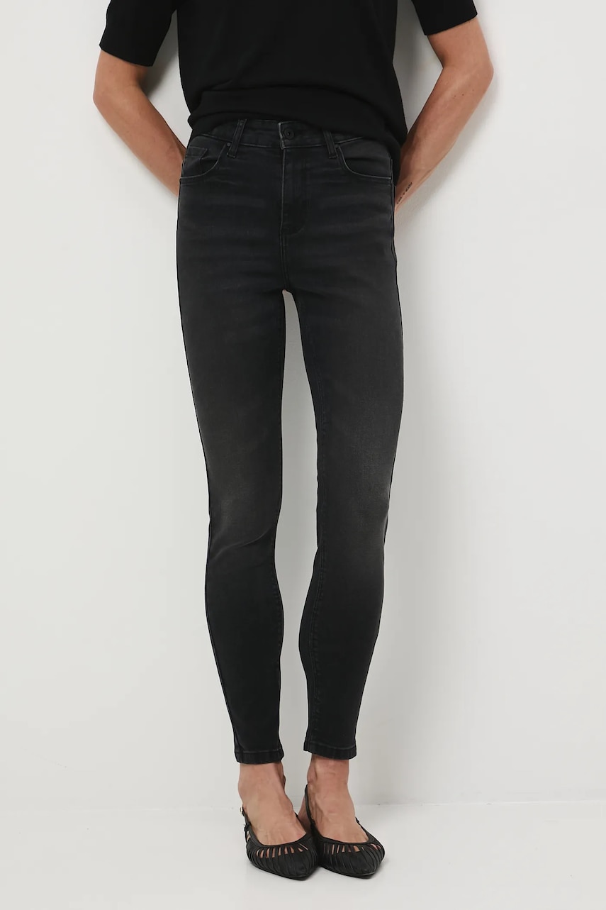 - Blugi pe lungime completă cu picioare conice strânse care creează un efect de „a doua piele”. Această croială face blugii să adere de corp, accentuează linia taliei și subliniază silueta, iar materialul elastic mărește confortul la purtare.