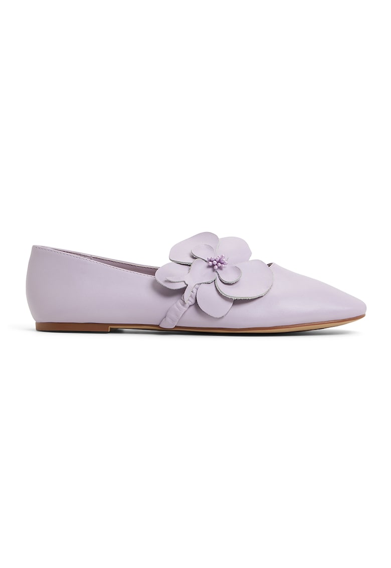 Caracteristici Culoare: lila Material: piele naturala Imprimeu: uni Stil: elegant Varf: patrat Detalii: aplicatie in forma de floare Sistem inchidere: fara inchidere Compozitie Partea superioara: piele Material interior: alte materiale Material talpa: alte materiale