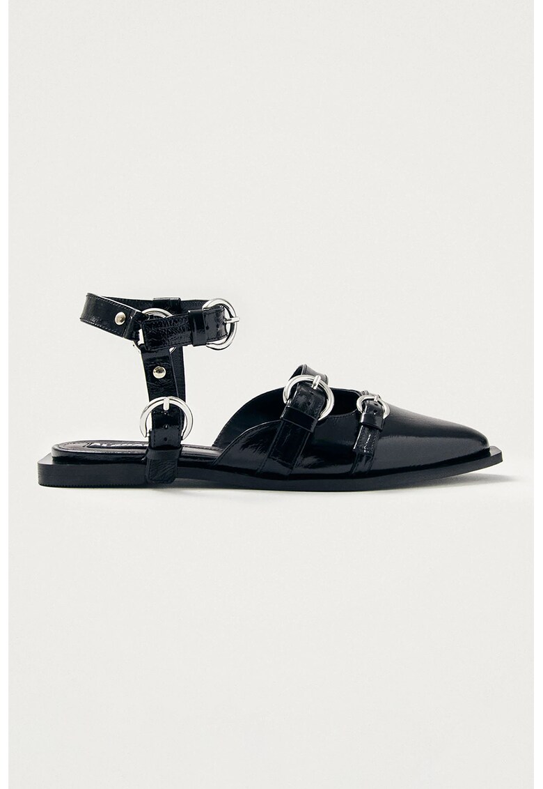 Caracteristici Tip: cu talpa joasa Material: piele lacuita Culoare: negru Imprimeu: uni Stil: casual Varf: ascutit Tip talpa: plata Sistem inchidere: catarama Compozitie Partea superioara: piele lacuita Material interior: piele Material talpa: alte materiale