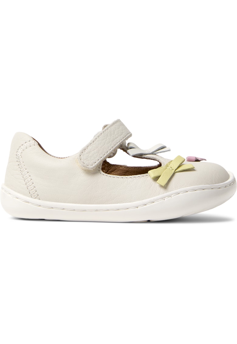 Caracteristici Tip produs: balerini Culoare: alb Imprimeu: uni Stil: casual Material: piele naturala Sistem inchidere: velcro Tip talpa: plata Detalii: fundite aplicate Compozitie Partea superioara: piele Material interior: piele Material talpa: alte materiale