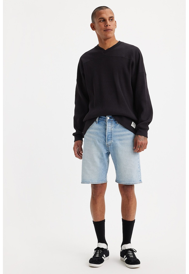 - albastru pal Material: denim Imprimeu: uni Croiala: regular fit Talie: medie Lungime: scurti Buzunare: 5 Detalii: aspect decolorat Sistem inchidere: nasturi Compozitie Exterior: 99% bumbac