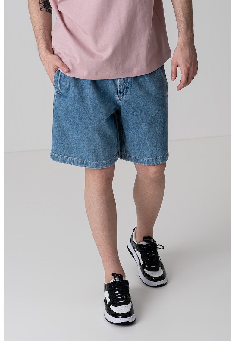 Caracteristici Culoare: albastru pastel Material: denim Imprimeu: uni Croiala: relaxed fit Talie: medie Lungime: scurti Buzunare: in cusaturile laterale
