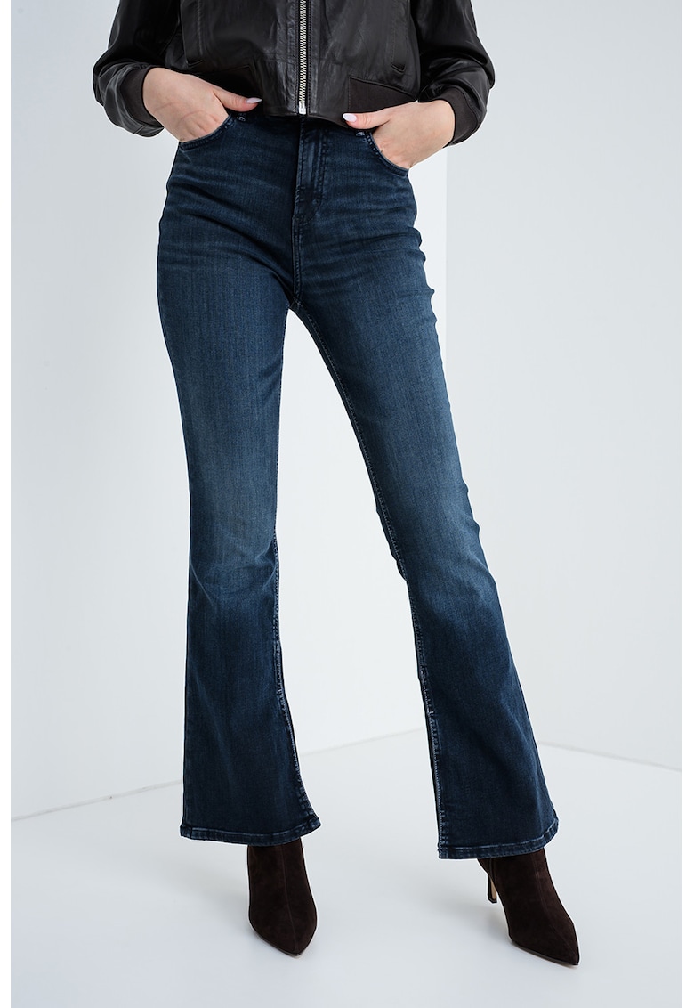Caracteristici Culoare: albastru ultramarin Imprimeu: uni Croiala: bootcut Material: denim Talie: inalta Lungime: lungi Buzunare: 5 Sistem inchidere: fermoar Detalii: slituri la terminatie Compozitie Exterior: 91% bumbac