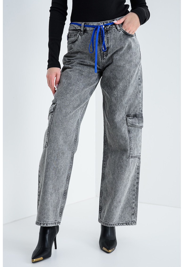 Caracteristici Culoare: gri melange Imprimeu: uni Croiala: croiala ampla Material: denim Talie: medie Lungime: lungi Buzunare: multiple Sistem inchidere: fermoar Detalii: cordon in talie Compozitie Exterior: 100% bumbac Info model Modelul poarta un produs de marimea W27-L32. Marimi model: 175 cm inaltime