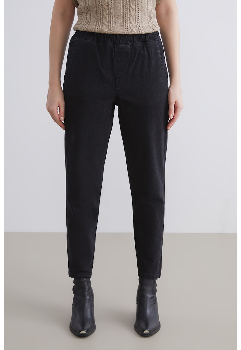 Caracteristici Culoare: negru Imprimeu: uni Croiala: conica Material: denim Talie: medie Lungime: crop Buzunare: aplicate pe partea din spate