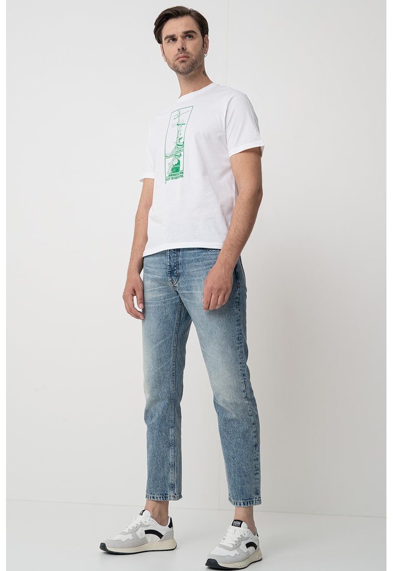 Caracteristici Culoare: albastru melange Material: denim Imprimeu: uni Croiala: slim fit Talie: medie Lungime: lungi Buzunare: 5 Compozitie Exterior: 100% bumbac Info model Modelul poarta un produs de marimea 32. Marimi model: 195 cm inaltime