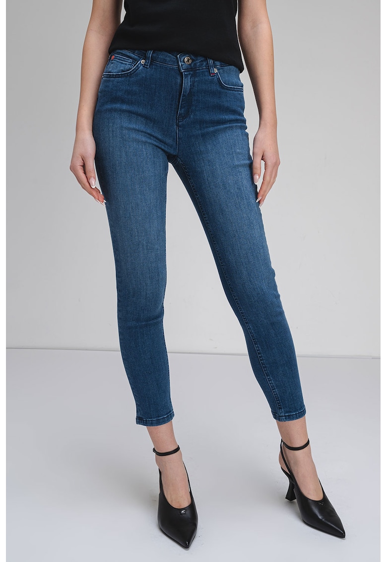 Caracteristici Culoare: albastru Imprimeu: uni Croiala: slim fit Material: denim Talie: inalta Lungime: crop Buzunare: 5 Sistem inchidere: nasturi Compozitie Exterior: 92% bumbac