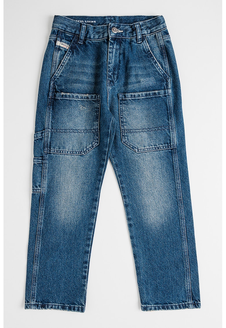 Caracteristici Tip produs: blugi Culoare: albastru melange Material: denim Stil: casual Imprimeu: uni Croiala: regular fit Talie: medie Buzunare: multiple