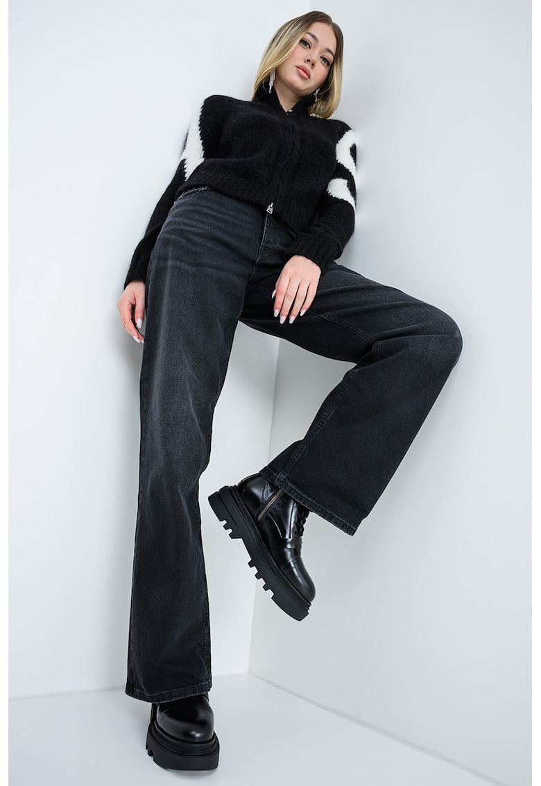 Caracteristici Culoare: negru stins Imprimeu: uni Croiala: croiala ampla Material: denim Talie: inalta Lungime: lungi Buzunare: 5 Sistem inchidere: nasturi Compozitie Exterior: 66% bumbac
