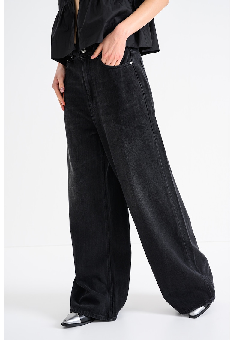Caracteristici Culoare: negru stins Imprimeu: uni Croiala: croiala ampla Material: denim Talie: inalta Lungime: lungi Buzunare: 5 Sistem inchidere: fermoar Compozitie Exterior: 60% bumbac