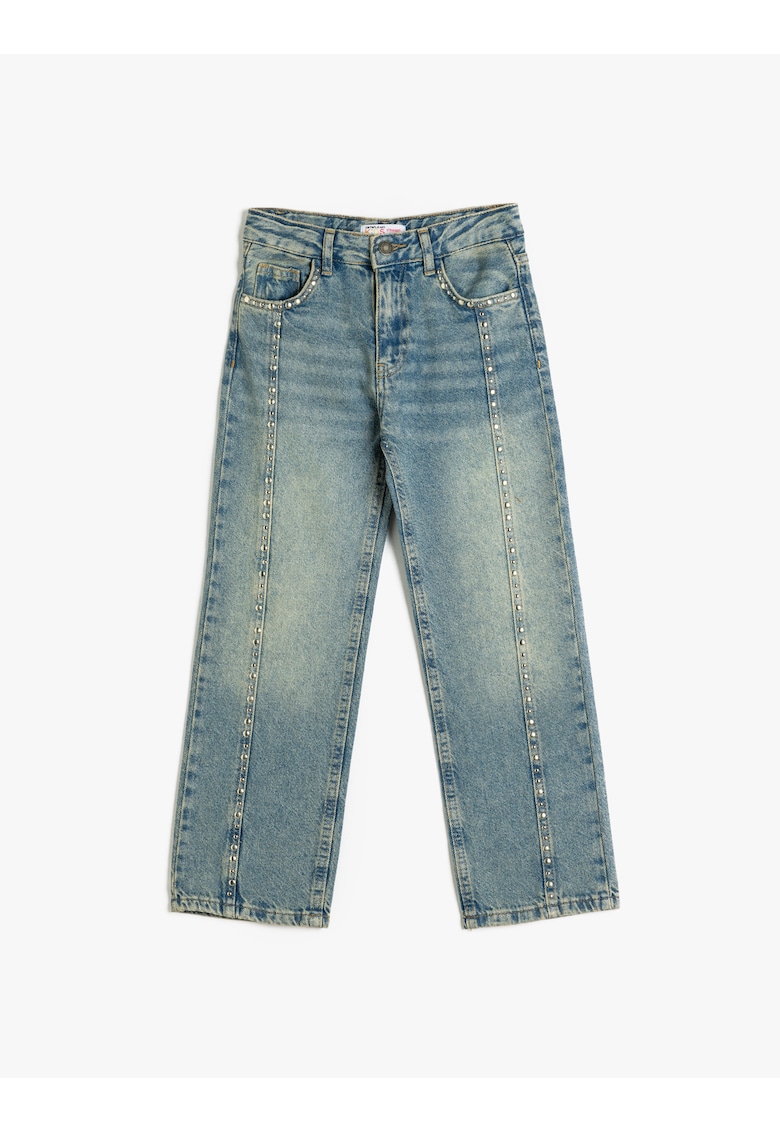 Caracteristici Tip produs: blugi Culoare: indigo Material: bumbac Stil: casual Imprimeu: uni Croiala: dreapta Talie: medie Buzunare: 5 buzunare Detalii: aplicatii cu nituri Sistem inchidere: nasturi Colectie: primavara