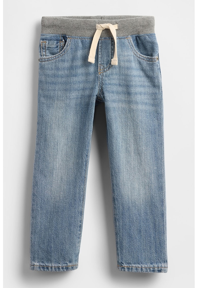 Caracteristici Tip produs: blugi Culoare: albastru prafuit Material: denim Stil: casual Imprimeu: uni Croiala: dreapta Talie: medie Buzunare: 5 Detalii: banda elastica in talie cu snur pentru ajustare Sistem inchidere: fara inchidere Colectie: primavara