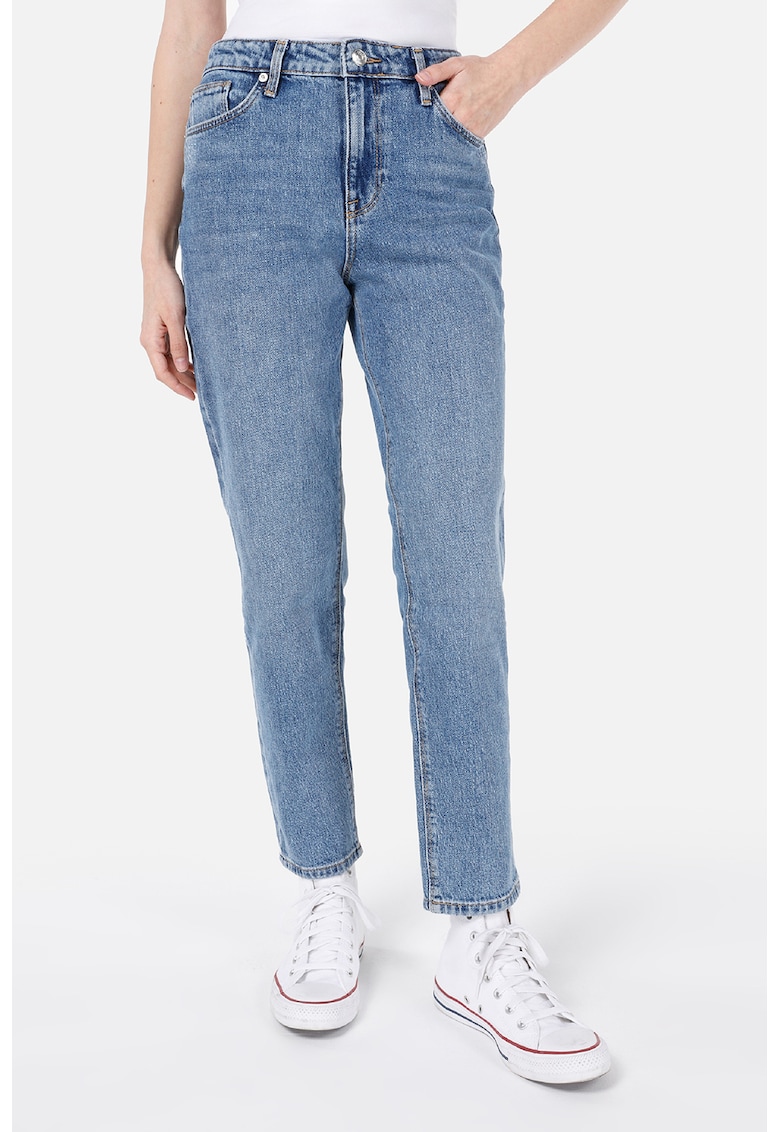 Caracteristici Culoare: albastru prafuit Imprimeu: uni Croiala: dreapta Material: denim Talie: inalta Lungime: lungi Buzunare: 5 Sistem inchidere: fermoar Detalii: aspect decolorat Compozitie Exterior: 97% bumbac