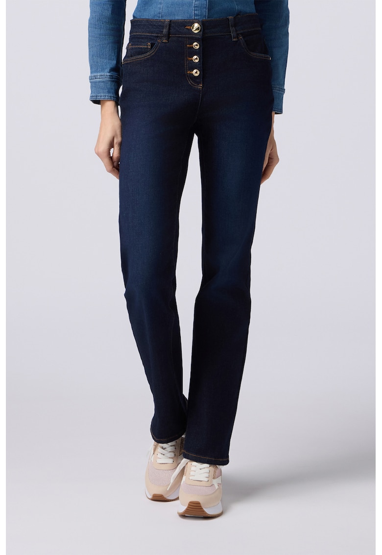 Caracteristici Culoare: bleumarin Imprimeu: uni Croiala: regular fit Material: denim Talie: medie Lungime: lungi Buzunare: 5 Sistem inchidere: nasturi Detalii: cusaturi contrastante Compozitie Exterior: 66% bumbac
