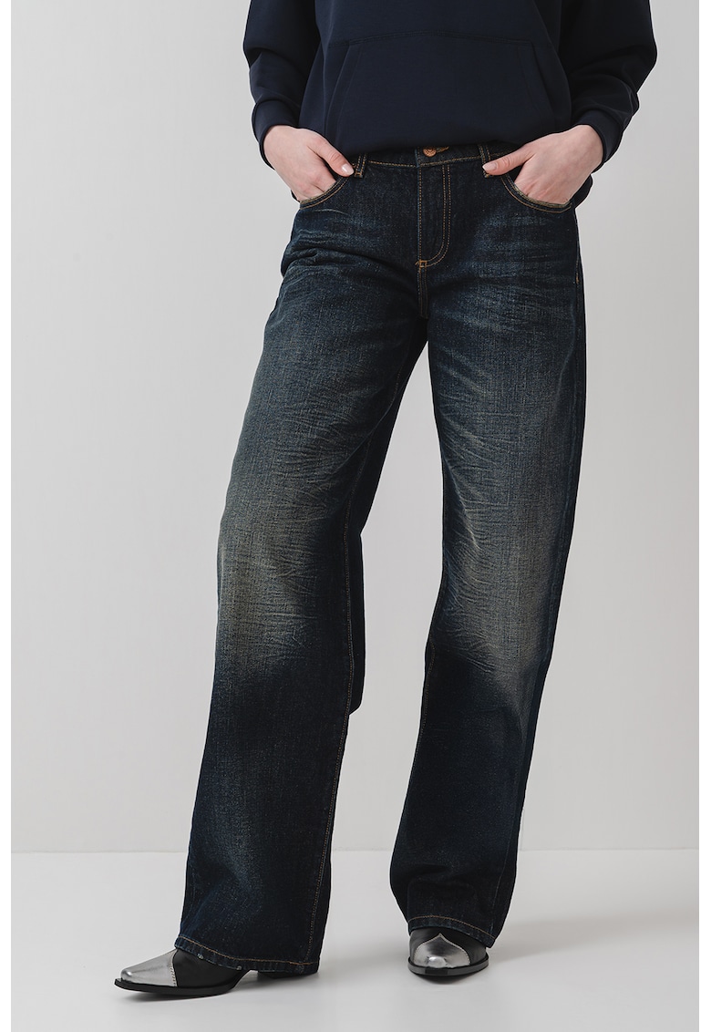 Caracteristici Culoare: bleumarin Imprimeu: uni Croiala: dreapta Material: bumbac Talie: medie Lungime: lungi Buzunare: 5 Compozitie Exterior: 100% bumbac Info model Modelul poarta un produs de marimea 27. Marimi model: 176 cm inaltime