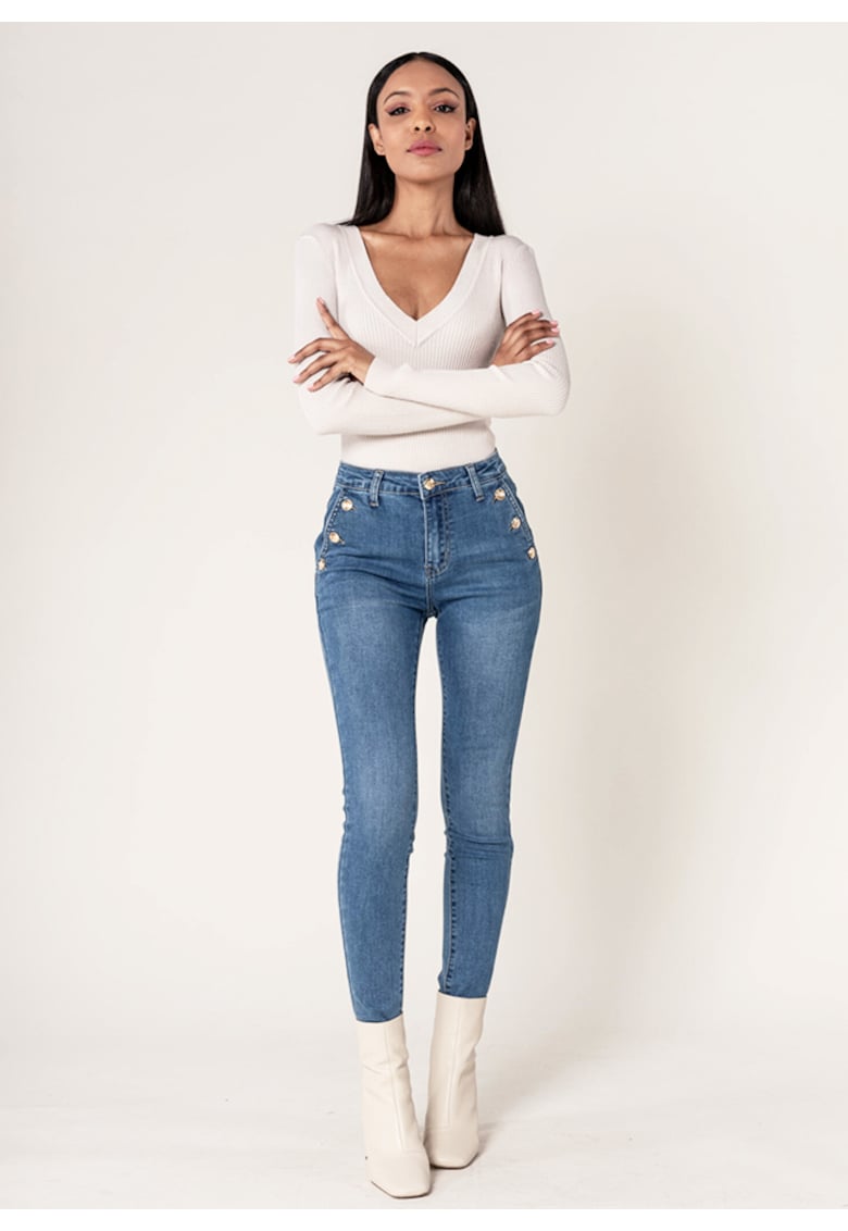Caracteristici Culoare: albastru Imprimeu: uni Croiala: slim fit Material: denim Talie: inalta Lungime: lungi Buzunare: 5 buzunare Sistem inchidere: fermoar