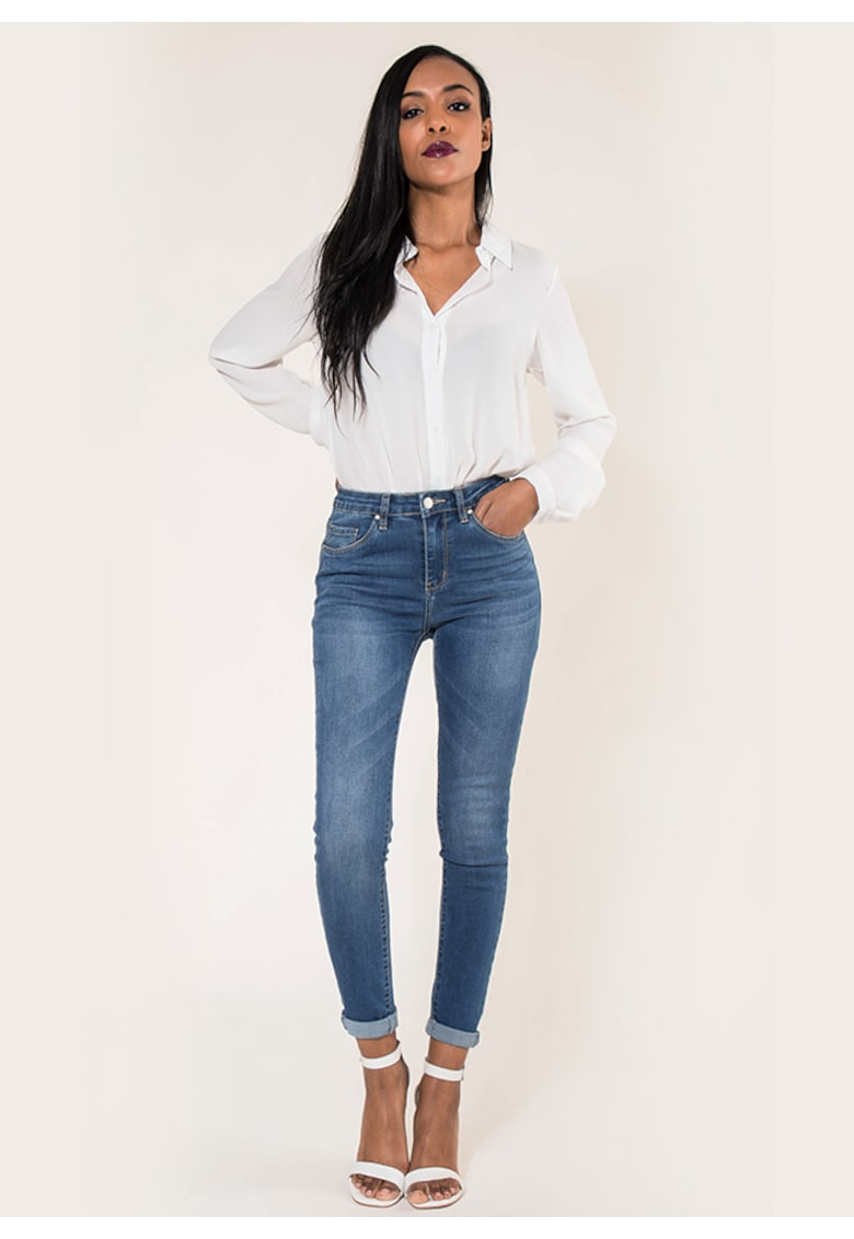 Caracteristici Culoare: albastru Imprimeu: uni Croiala: slim fit Material: denim Talie: inalta Lungime: lungi Buzunare: 5 buzunare Sistem inchidere: fermoar