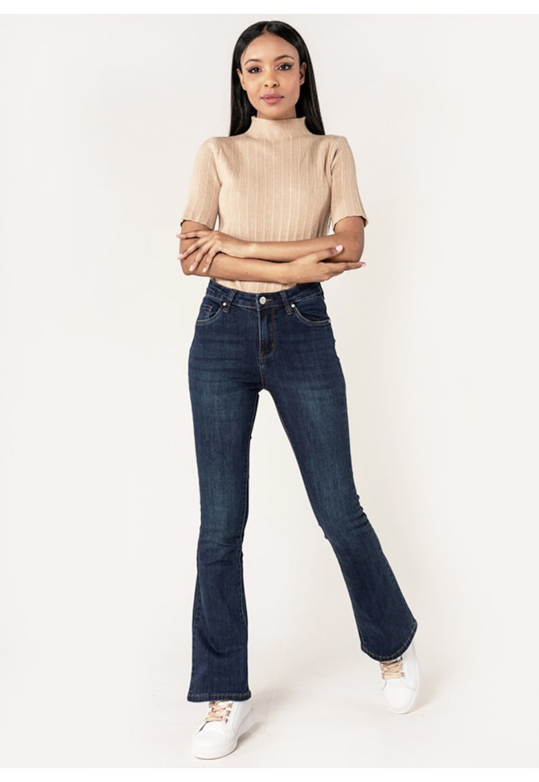 Caracteristici Culoare: indigo Imprimeu: uni Croiala: evazat Material: denim Talie: inalta Lungime: lungi Buzunare: 5 buzunare Sistem inchidere: fermoar