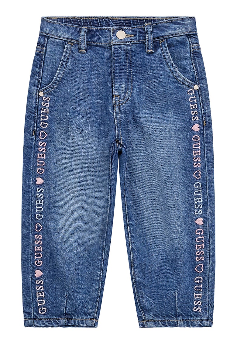 Caracteristici Tip produs: blugi Culoare: albastru prafuit Material: denim Stil: casual Imprimeu: logo Croiala: dreapta Talie: medie Buzunare: 4 Detalii: banda elastica in talie Sistem inchidere: fermoar Colectie: primavara