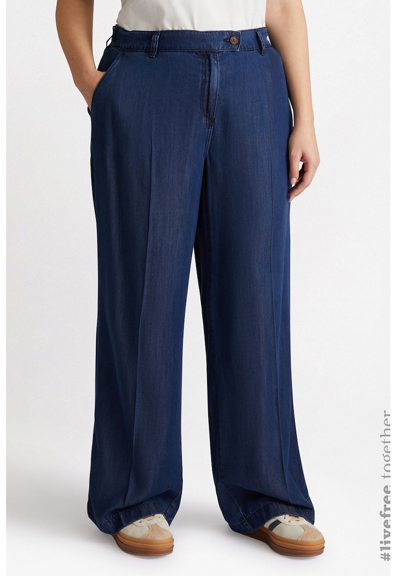 Caracteristici Culoare: albastru inchis Imprimeu: uni Croiala: curvy Material: lyocell Talie: inalta Lungime: lungi Buzunare: laterale Sistem inchidere: fermoar Detalii: acest produs se adreseaza femeilor cu forme pline (plus size). Compozitie Exterior: 100% lyocell