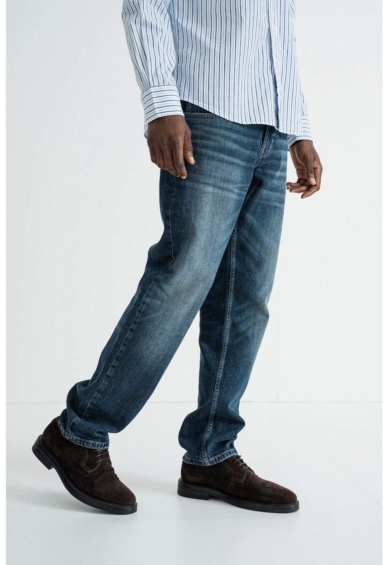 Caracteristici Culoare: petrol Material: denim Croiala: dreapta Talie: medie Lungime: lungi Buzunare: 5 Detalii: bucle pentru curea Compozitie Exterior: 99% bumbac -1% elastan Info model Modelul poarta un produs de marimea W32-L32. Marimi model: 184 cm inaltime