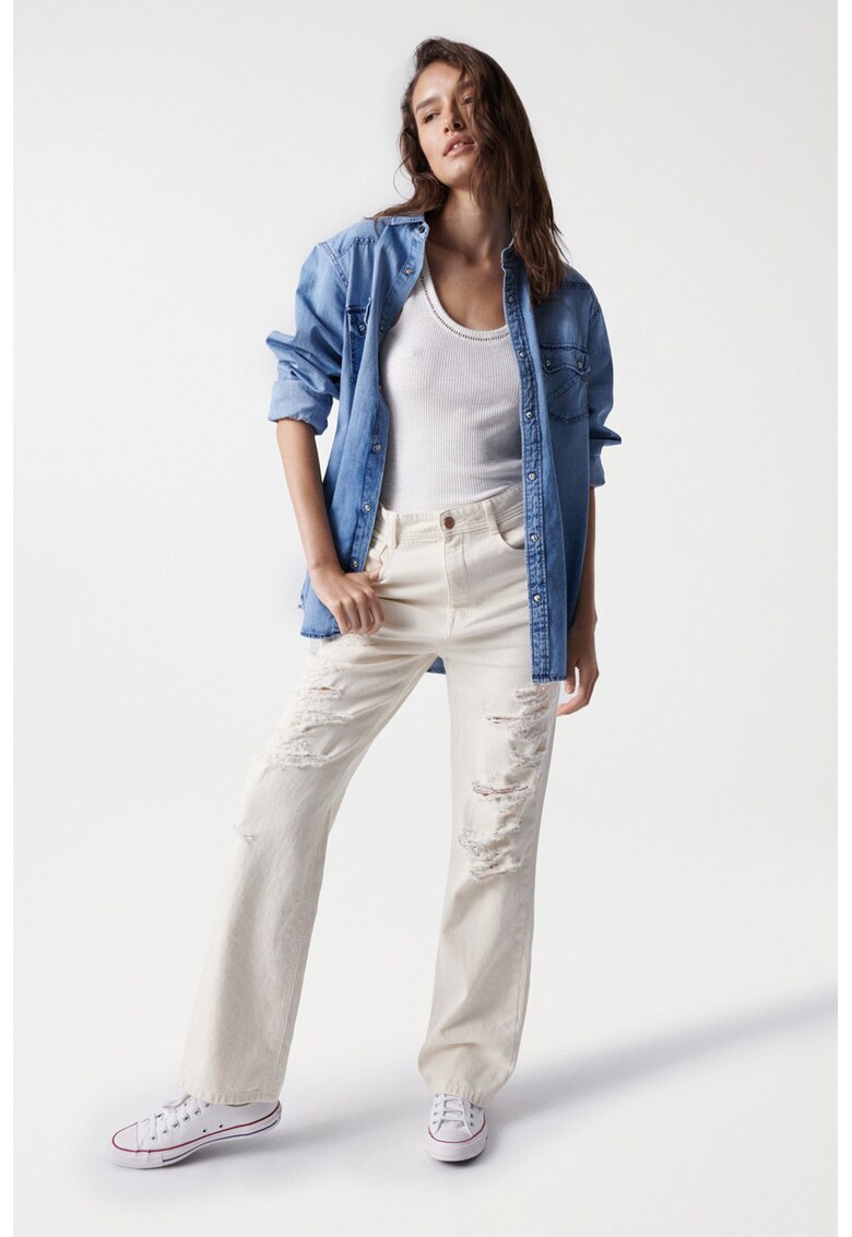 Caracteristici Culoare: alb murdar Imprimeu: uni Croiala: dreapta Material: denim Talie: inalta Lungime: lungi Buzunare: 5 Sistem inchidere: fermoar Detalii: detalii cu aspect deteriorat Compozitie Exterior: 94% bumbac