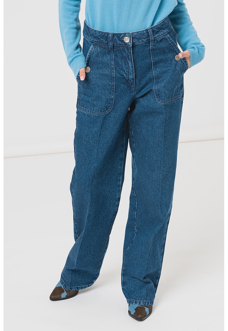 Caracteristici Culoare: albastru Imprimeu: uni Croiala: dreapta Material: denim Talie: inalta Lungime: lungi Buzunare: 4 Sistem inchidere: fermoar Compozitie Exterior: 100% bumbac Info model Modelul poarta un produs de marimea S/40 IT. Marimi model: 173 cm inaltime