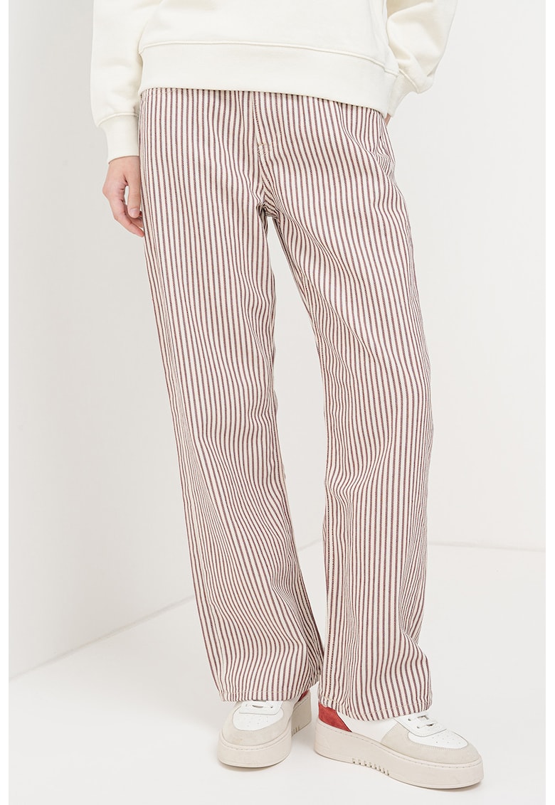 Caracteristici Culoare: bej Imprimeu: dungi Croiala: dreapta Material: bumbac Talie: medie Lungime: lungi Buzunare: 5 Compozitie Exterior: 100% bumbac Info model Modelul poarta un produs de marimea W27-L30. Marimi model: 177 cm inaltime