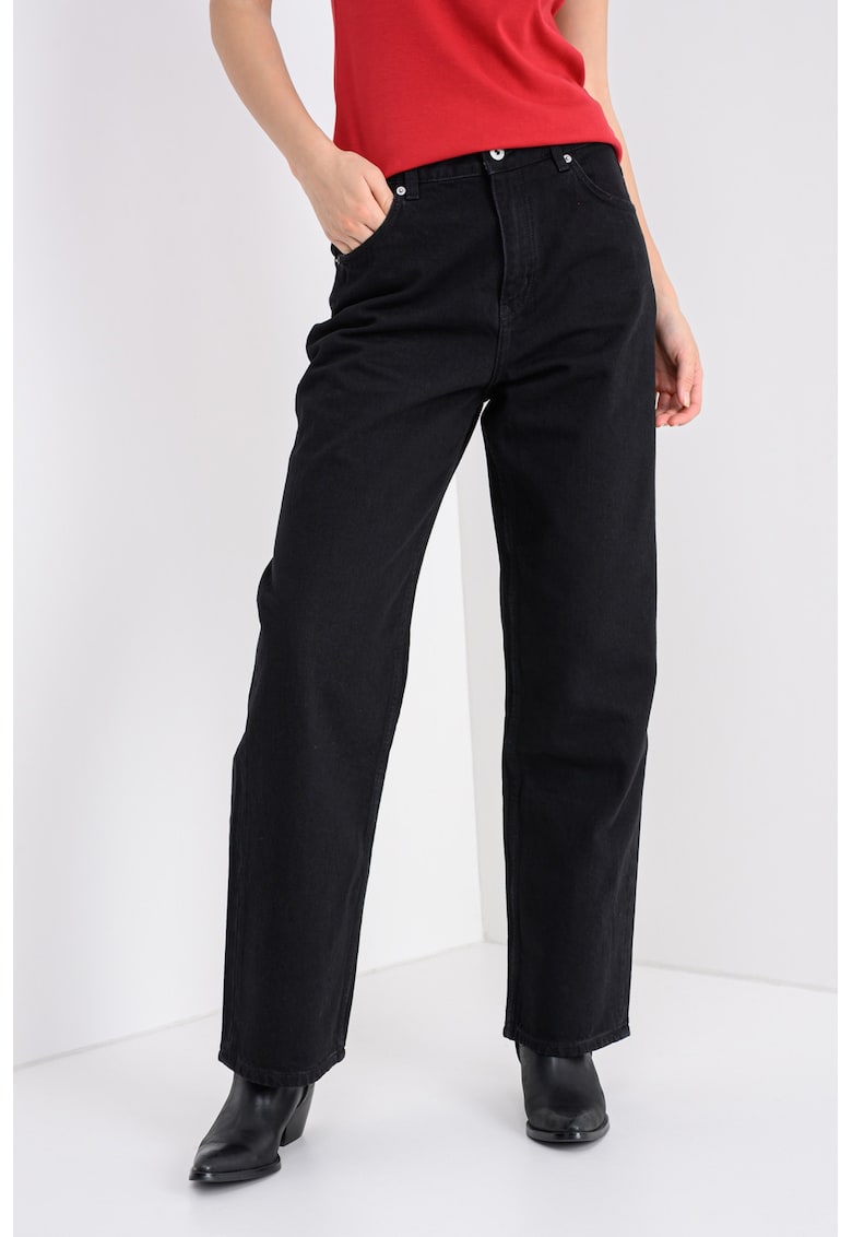 Caracteristici Culoare: negru Imprimeu: logo Croiala: dreapta Material: denim Talie: inalta Lungime: lungi Buzunare: 5 Sistem inchidere: fermoar Compozitie Exterior: 100% bumbac Info model Modelul poarta un produs de marimea W27-L32. Marimi model: 180 cm inaltime