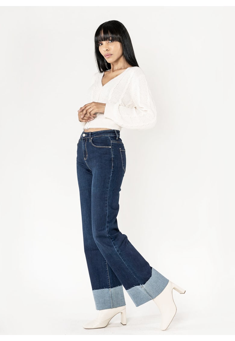 Caracteristici Culoare: albastru inchis Imprimeu: uni Croiala: evazat Material: denim Talie: inalta Lungime: lungi Buzunare: 5 buzunare Sistem inchidere: fermoar