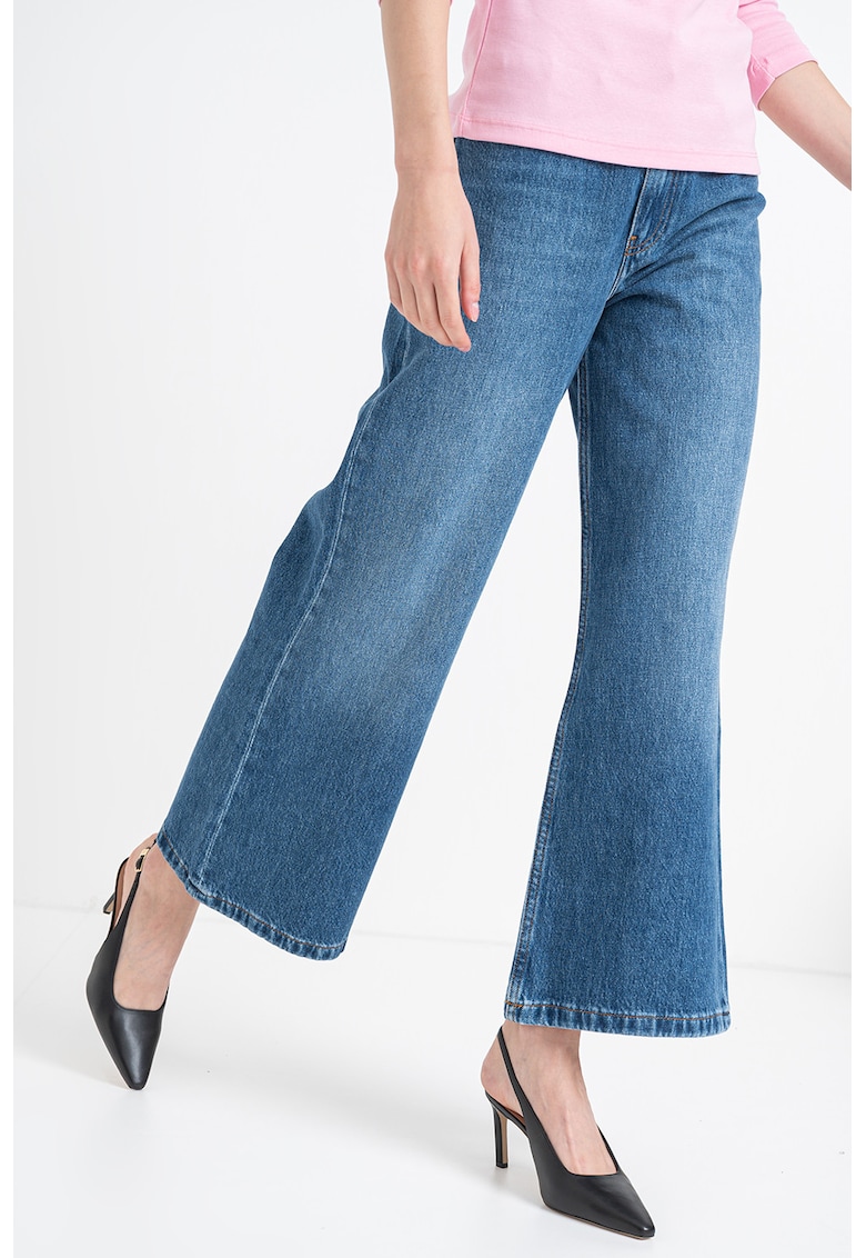 Caracteristici Culoare: albastru inchis Imprimeu: uni Croiala: evazat Material: denim Talie: inalta Lungime: crop Buzunare: 5 Sistem inchidere: fermoar Compozitie Exterior: 50% bumbac regenerat