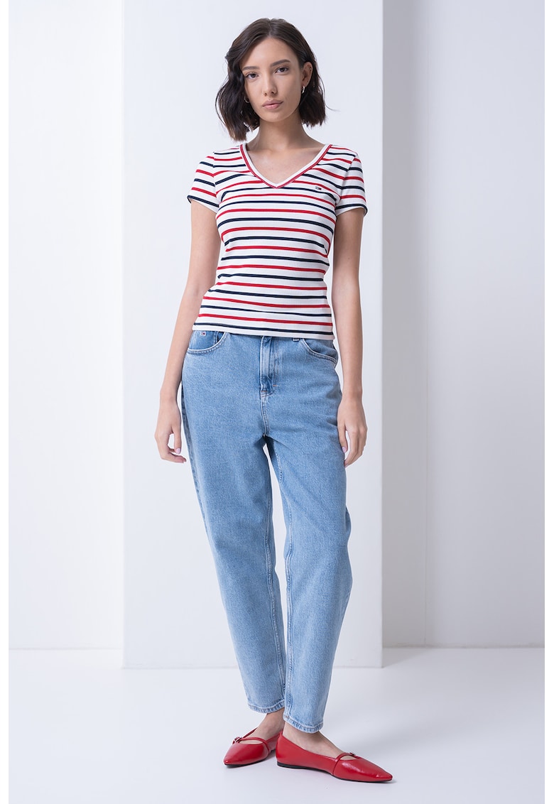 Caracteristici Culoare: albastru pal Imprimeu: uni Croiala: mom fit Material: bumbac organic