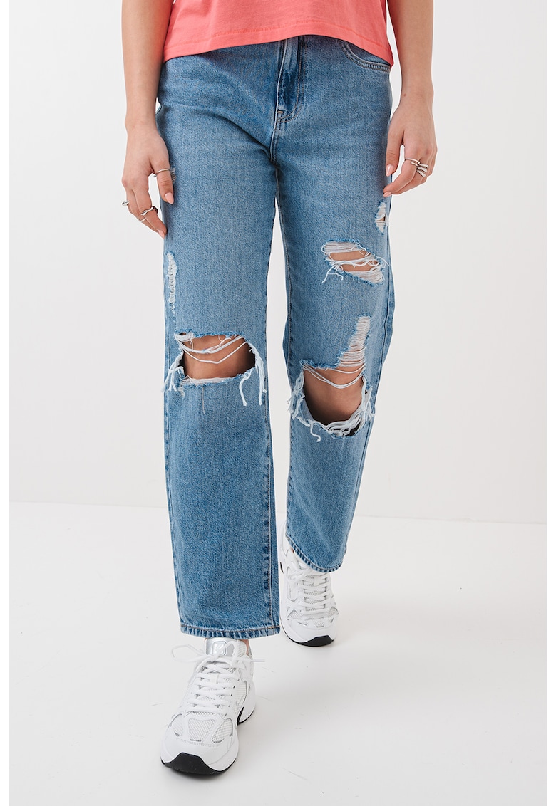 Caracteristici Culoare: albastru deschis Imprimeu: uni Croiala: mom fit Material: denim Talie: inalta Lungime: lungi Sistem inchidere: fermoar Compozitie Exterior: 100% bumbac Info model Modelul poarta un produs de marimea W27-L32. Marimi model: 174 cm inaltime