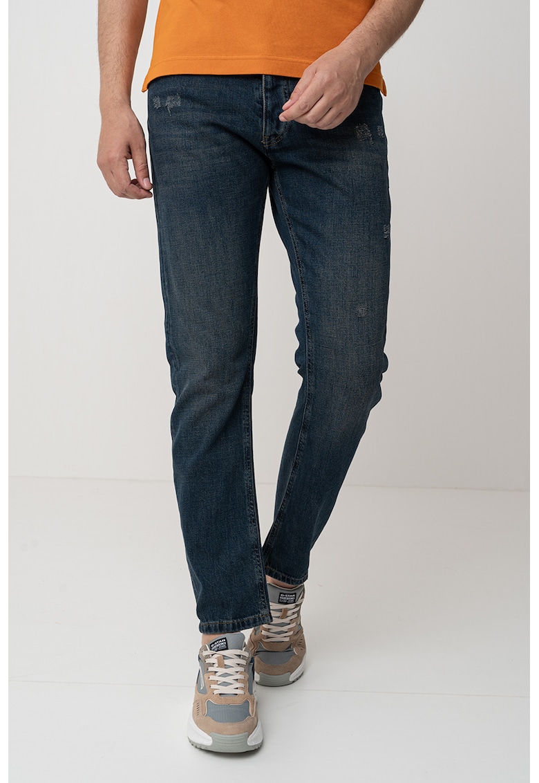 Caracteristici Culoare: bleumarin Material: denim Imprimeu: uni Croiala: regular fit Talie: medie Lungime: lungi Buzunare: 5 Sistem inchidere: nasturi Compozitie Exterior: 100% bumbac Info model Modelul poarta un produs de marimea 32. Marimi model: 195 cm inaltime