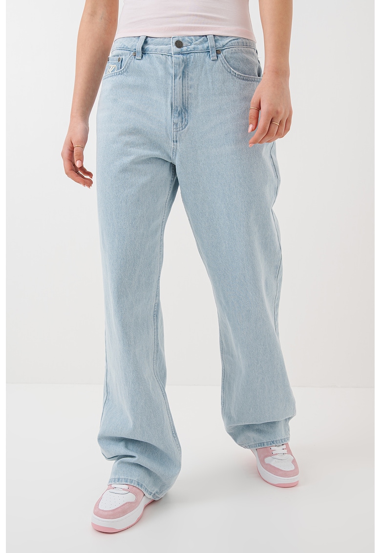 Caracteristici Culoare: albastru deschis Imprimeu: uni Croiala: relaxed fit Material: denim Talie: inalta Lungime: lungi Buzunare: 5 Compozitie Exterior: 100% bumbac Info model Modelul poarta un produs de marimea 27. Marimi model: 174 cm inaltime
