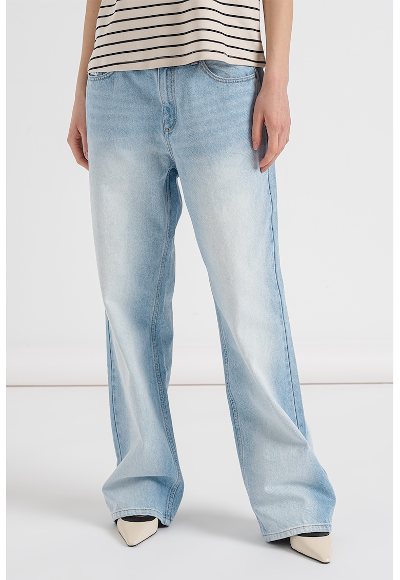 Caracteristici Culoare: albastru deschis Imprimeu: uni Croiala: relaxed fit Material: denim Talie: inalta Lungime: lungi Buzunare: 5 Detalii: bucle pentru curea Compozitie Exterior: 100% bumbac Info model Modelul poarta un produs de marimea 27. Marimi model: 176 cm inaltime