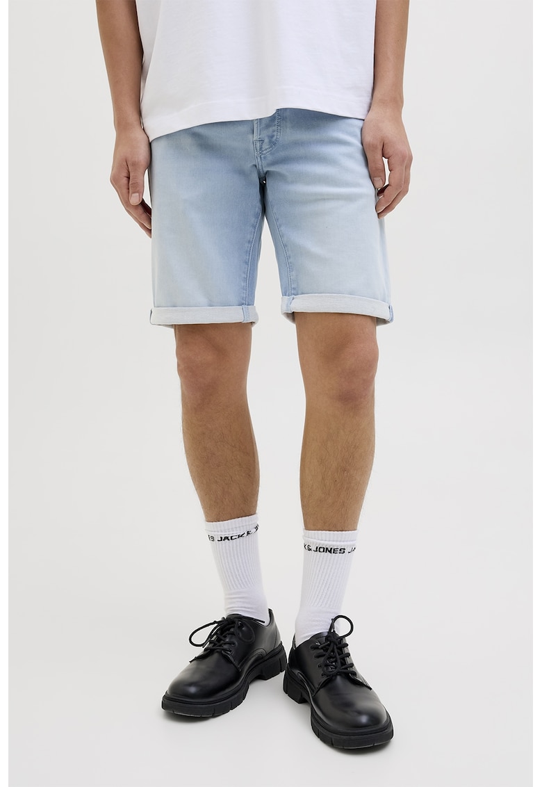 Caracteristici Culoare: albastru deschis Material: denim Imprimeu: uni Croiala: regular fit Talie: medie Lungime: scurti Buzunare: 5 Detalii: aspect decolorat Sistem inchidere: nasturi Compozitie Exterior: 43% bumbac