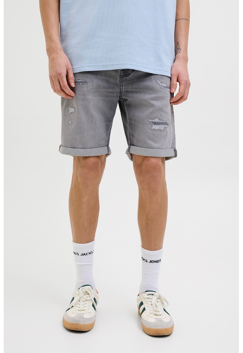 Caracteristici Culoare: gri Material: denim Imprimeu: uni Croiala: regular fit Talie: joasa Lungime: scurti Buzunare: 5 Detalii: detalii cu aspect deteriorat Sistem inchidere: fermoar Compozitie Exterior: 81% bumbac
