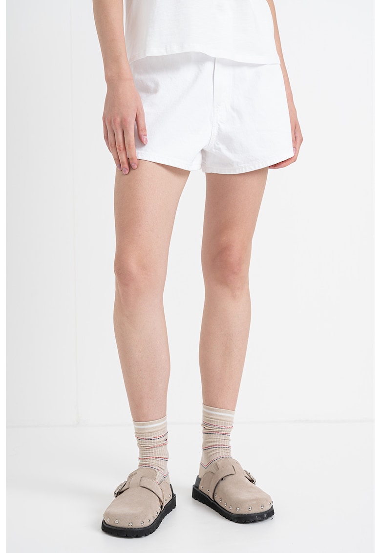 Caracteristici Culoare: alb optic Imprimeu: uni Croiala: evazat Material: denim Talie: inalta Lungime: scurti Buzunare: 5 Sistem inchidere: fermoar Compozitie Exterior: 80% bumbac