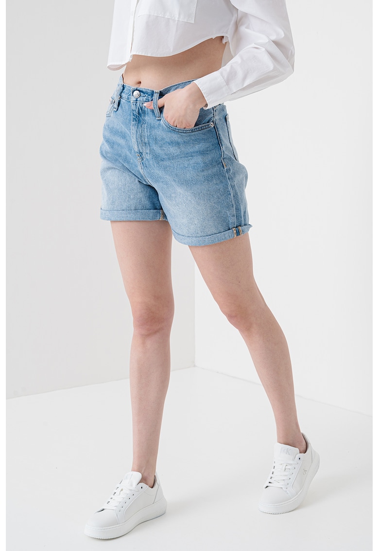 Caracteristici Culoare: albastru glaciar Imprimeu: uni Croiala: regular fit Material: denim Talie: inalta Lungime: scurti Buzunare: pe partea din fata si pe partea din spate Sistem inchidere: fermoar Compozitie Exterior: 80% bumbac