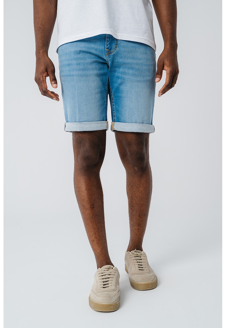 Caracteristici Culoare: albastru melange Material: denim Imprimeu: uni Croiala: dreapta Talie: medie Lungime: scurti Buzunare: 5 Sistem inchidere: fermoar Compozitie Exterior: 89% bumbac