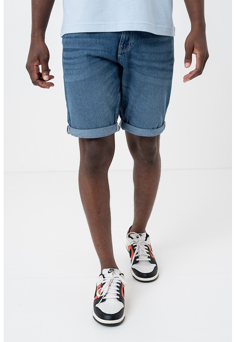 Caracteristici Culoare: albastru melange Material: denim Imprimeu: uni Croiala: regular fit Talie: medie Lungime: scurti Buzunare: 5 Sistem inchidere: fermoar Compozitie Exterior: 100% bumbac Info model Modelul poarta un produs de marimea 32. Marimi model: 184 cm inaltime