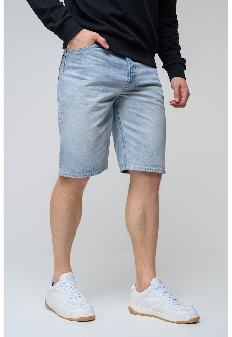 Caracteristici Culoare: albastru deschis Material: bumbac Imprimeu: uni Croiala: regular fit Talie: medie Lungime: scurti Buzunare: 5 Compozitie Exterior: 100% bumbac Info model Modelul poarta un produs de marimea S/31 EU. Marimi model: 191 cm inaltime