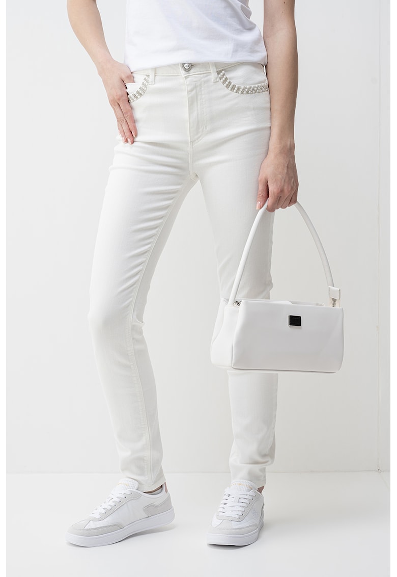 Caracteristici Culoare: alb fildes Imprimeu: uni Croiala: skinny Material: denim Talie: inalta Lungime: lungi Buzunare: 5 Sistem inchidere: fermoar Detalii: strasuri