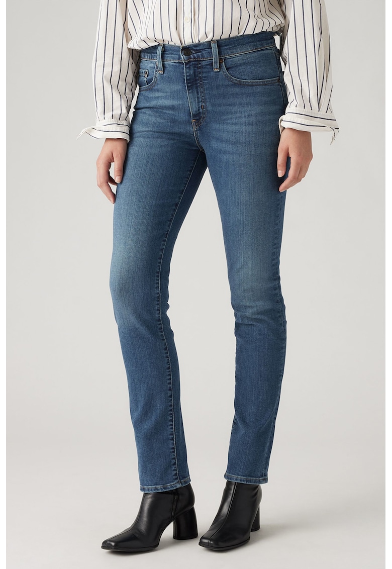 Caracteristici Culoare: albastru inchis melange Imprimeu: uni Croiala: regular fit Material: denim Talie: inalta Lungime: lungi Buzunare: 5 Sistem inchidere: nasturi Compozitie Exterior: 85% bumbac