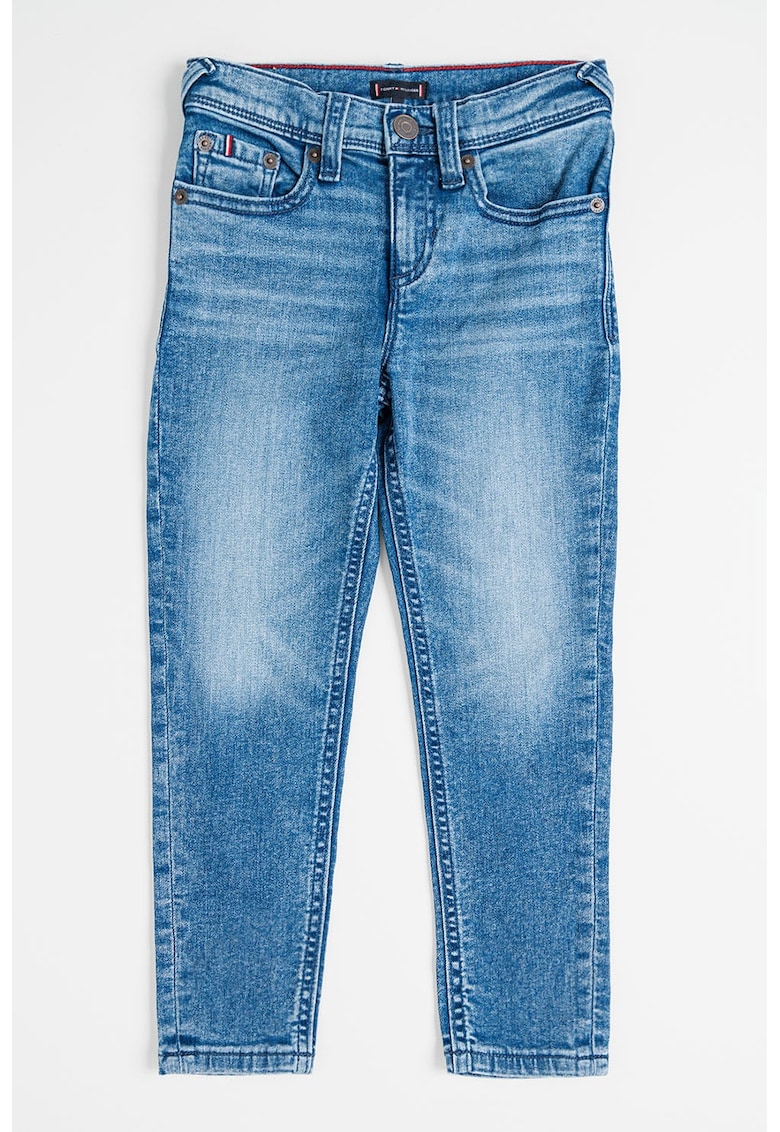 Caracteristici Tip produs: blugi Culoare: albastru inchis Material: denim Stil: casual Imprimeu: uni Croiala: slim fit Talie: medie Buzunare: 5 Detalii: aspect decolorat
