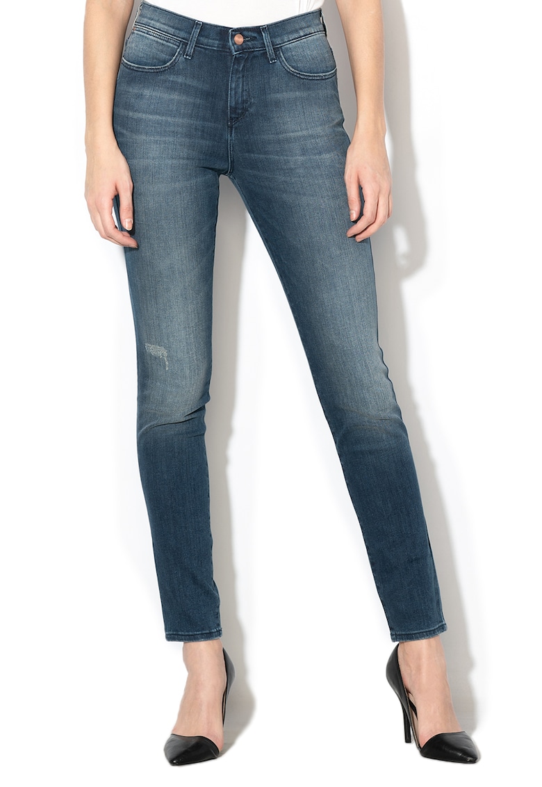 Caracteristici Culoare: albastru Imprimeu: uni Croiala: skinny Material: denim Talie: inalta Lungime: lungi Buzunare: 5 Sistem inchidere: fermoar