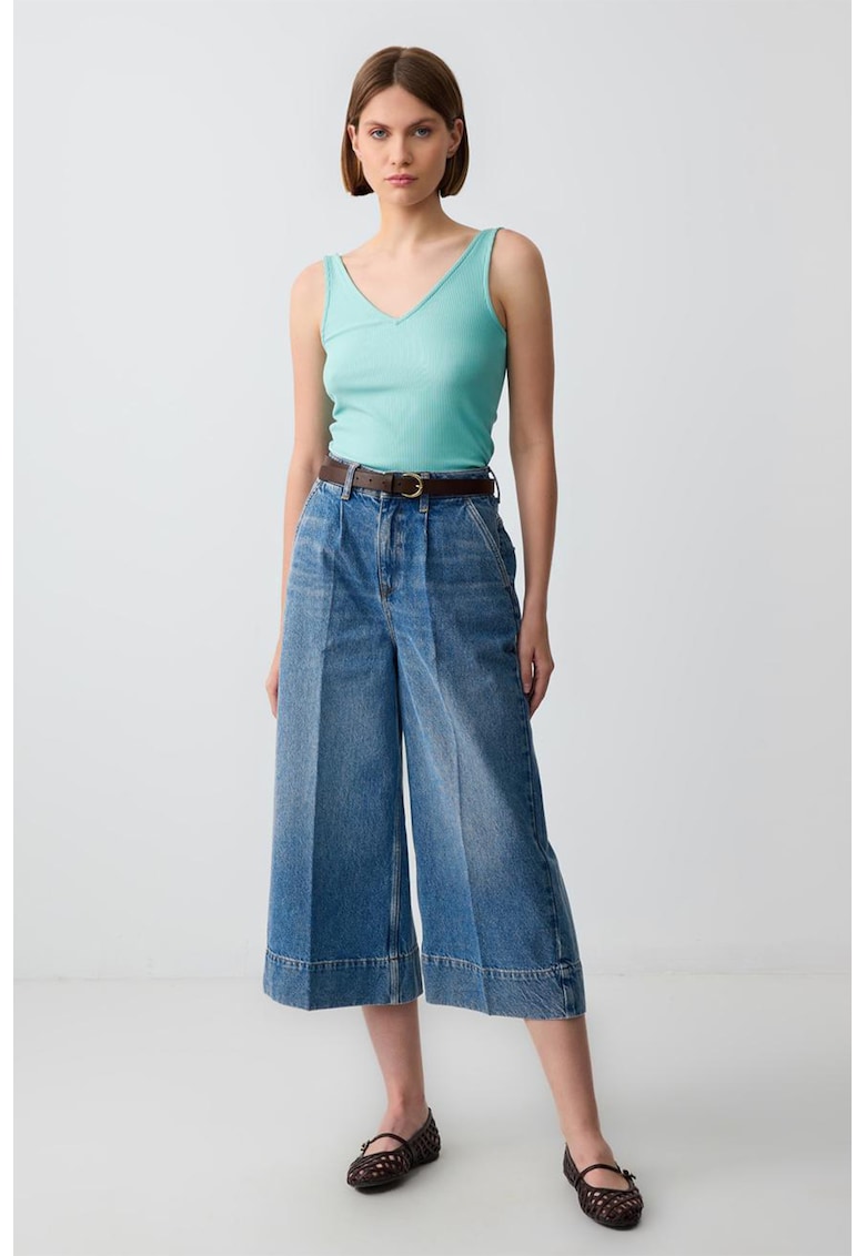 Caracteristici Culoare: albastru pastel Imprimeu: uni Croiala: croiala ampla Material: denim Talie: inalta Lungime: trei sferturi Buzunare: 2 oblice frontale
