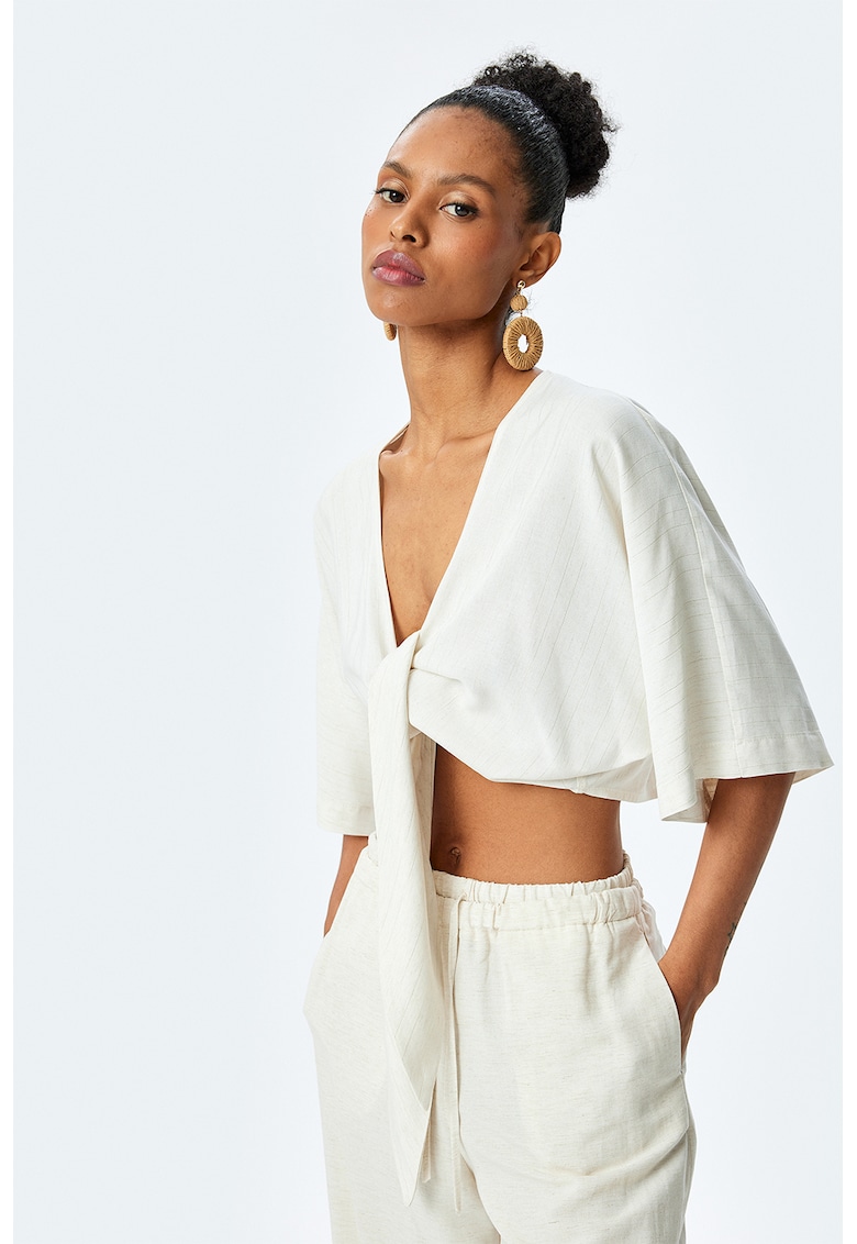 Caracteristici Culoare: alb murdar Imprimeu: dungi Stil: casual Croiala: crop Sistem inchidere: snur Material: viscoza